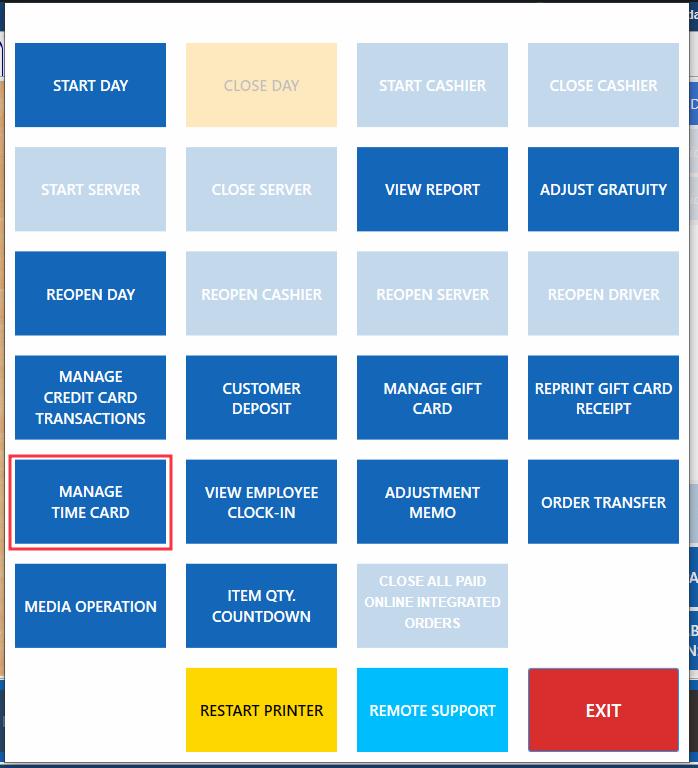 To access manage time card page, log in on the POS, then click MORE >>> MANAGE TIME CARD