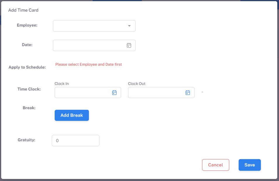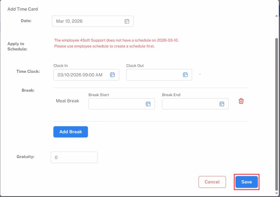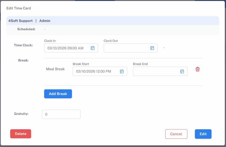 Break: You may add breaks for the employee and leave Break Start and/or Break End blank if employee will start/end the break on the POS later.